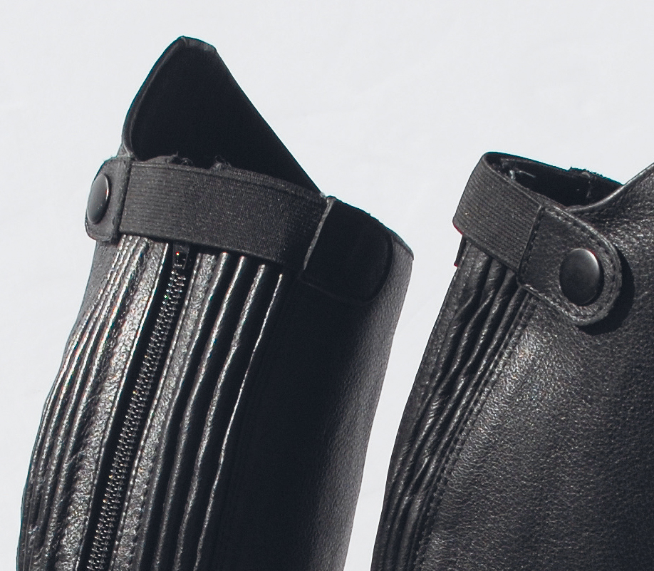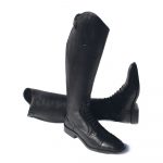 These luxury black leather riding boots are made in soft feel leather giving the upmost comfort to the wearer. They feature an elasticated front lace detail and stitch detail on the toe cap. With a user friendly wider smooth feel zip pull and two pleated, elasticated leather sections at the back of the boot for a comfortable fit. The top of the zip is finished off with an elasticated strap and plain black press stud to the side. With spur guards and a sure grip sole these boots are practical as well as gorgeous to wear.
