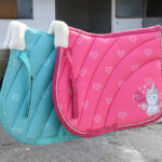 These super cute, small pony saddle pad cloths are fully padded with an arc quilted design, heart motif and breathable lining. With touch tape fasten girth secure straps and girth placement straps, fur wither pad for comfort. Finished with metallic three-tone rope binding and the cutest ‘Be Happy’ Unicorn Logo to both sides.
